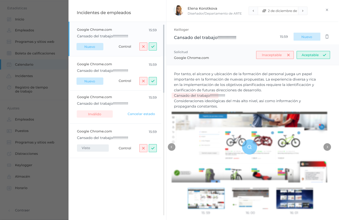 Las capturas de pantalla proporcionan una representación visual de las acciones de los empleados en su lugar de trabajo en diferentes momentos, ayudan a evaluar rápidamente la productividad de los subordinados y detectar infracciones de las normas.